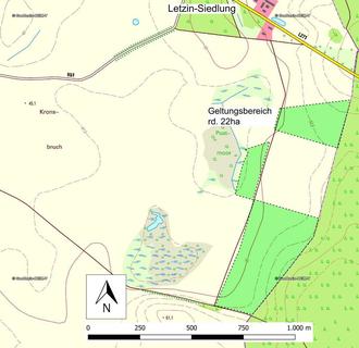 Der räumliche Geltungsbereich des Bebauungsplans beläuft sich auf eine Fläche von insgesamt ca. 22 ha und ist dem als Anlage 1 beigefügten flurstücksbezogenen Lageplan zu entnehmen. Er umfasst in der Gemarkung Letzin, Flur 4 die Flurstücke 9/2 und 15 (beide teilweise) sowie die Flurstücke 12 und 13.