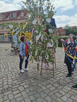 Ein Highlight des letzten Kinderfestes war der Wünschebaum, aufgestellt vom Stadtbauhof und liebevoll geschmückt mit bunten Bändern sowie 100 Anhänger in Wolken- bzw. Tropfenform, die mit Losnummern versehen waren. Der Kreativzirkel hatte die Anhänger gebastelt und dann gemeinsam beim Schmücken der Birke angebracht.
