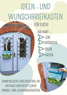 an unserem Rathaus gibt es jetzt einen Kinder- und Jugendbriefkasten. Wir freuen uns, wenn Ihr aktiv werdet! Habt Ihr Ideen, Anregungen, Wünsche, Bedenken oder einfach ein schönes Bild für uns? Dann her damit! Ihr findet ihn direkt an der Eingangstür, wenn Ihr von der Marktseite aus ins Rathaus wollt. Alternativ könnt Ihr uns auch eine Email schicken, unter jugendprojekte@altentreptow.de. Eure Vorschläge gehen dann direkt zur Bürgermeisterin, Frau Ellgoth, und sie schaut, wie wir gemeinsam in unserem Rathaus-Team eure Anliegen umsetzen können.