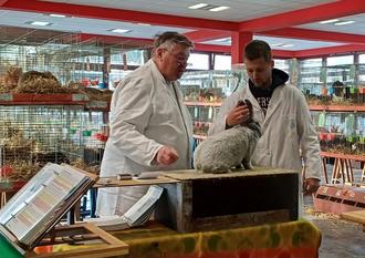 Preisrichter Arno Zachmann und Hilfsrichter Marcus Winter bei der Bewertung der Kaninchen