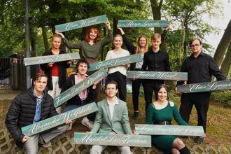 Erstes Studienjahr, v. l. n. r., stehend: Nadeche, Elisa Härtel, Isabel Siewert, Ronja Gericke, Fredrik Wessel, Elias Lorenz; sitzend: Alexander Wolfshohl, Ferrenc David Baschin, Maickel Leo Tyrchan, Lisa Franziska Lange