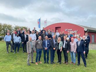 4. biogeniV-Bündnisversammlung am 25.10.2023: (1. Reihe vorne v. links nach rechts): Hr. Prof. Uhrlandt, Hr. Hink, Hr. Dr. Klebingat (alle INP), Bürgermeister Hr. Galander (HA), Fr. Stukenbrock (CBC), Hr. Schweitzer (bse methanol Leipzig), Hr. Peters (HA) und Hr. Sauer (GF CBC)