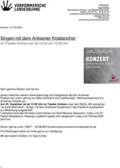 Am 23. Dezember ist ab 15:00 Uhr im Theater Anklam unter dem Motto „Wir wünschen ‘ne frohe Weihnacht - Singen mit dem Anklamer Knabenchor“ das Publikum ausdrücklich zur Mitwirkung aufgefordert.