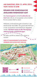 Am Samstag, den 12. April, folgt die große Innenstadt-Aktion „Anklam putzt sich raus“. Die Einzelhändler und das Citymanagement laden dazu ein, gemeinsam Straßen, Gehwege und Plätze zu säubern, um Anklam als attraktiven Einkaufs- und Aufenthaltsort zu präsentieren.