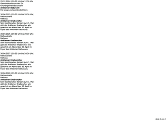 09.11.2024 | 16:00 Uhr bis 18:00 Uhr | Gemeindezentrum der Ev. 13.12.2024 - 15.12.2024 | 10:00 Uhr bis