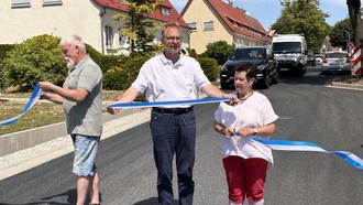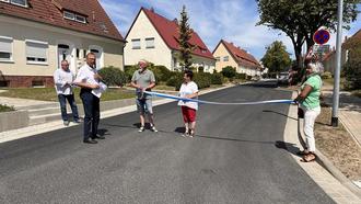 Die Baumaßnahme dauerte 14 Monate und bildet den letzten Bauabschnitt des Gellendiner Weges. Gerlinde Rennhack und Lutz Krause durchschnitten das obligatorische Band zusammen mit Bürgermeister Michael Galander.