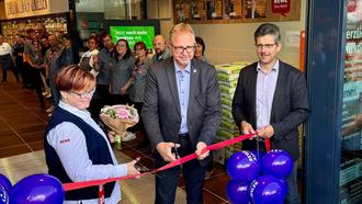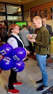 Den ersten Kunden begrüßte Melanie Patzer zusammen mit Bürgermeister Michael Galander und REWE-Vertriebsleiter Region Ost Veit Kamm, nachdem das obligatorische rote Band durchschnitten wurde.