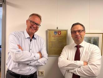 Gemeinsam vor der Partnerschaftsurkunde von 1994 – Bürgermeister Michael Galander und der Gemeindedirektor von Burlöv, Fredrik Löfqvist