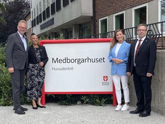 Nach dem intensiven Arbeitstreffen vor dem Medborgarhuset (Mitbürgerhaus) der Gemeinde Burlöv, von links Bürgermeister Michael Galander, Maria Popoola (Sozialamtsleiterin der Gemeinde Burlöv), Agnieszka Vanhöfen (Wirtschaftsförderung/Internationale Zusammenarbeit Hansestadt Anklam) und Fredrik Löfqvist (Gemeindedirektor Burlöv)