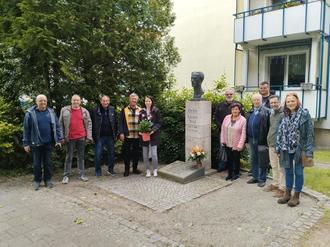 Vereinsmitglieder des „FOLA“ mit Geburtstagsblumen an der Büste Otto Lilienthals, 23.05.2025