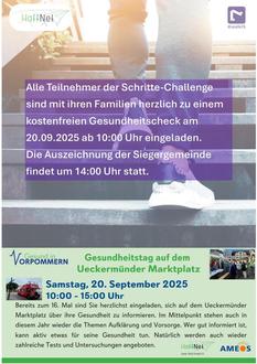 Die feierliche Siegerehrung findet am 20. September 2025 um 14:00 Uhr auf dem Marktplatz in Ueckermünde statt - im Rahmen des 16. Gesundheitstages der Gesundheitsregion Vorpommern. Von 10:00 bis 15:00 Uhr erwartet die Besucher ein vielfältiges Programm mit kostenfreien Gesundheitschecks: von Schilddrüsen-Ultraschall, Herz-Kreislauf- und Diabetesberatung über Seh- und Hörtests bis hin zu Messungen der Körperzusammensetzung. Auch neue Angebote wie interaktives Hirnleistungstraining, Medikamentenanalyse oder Einblicke ins Schröpfen und physiotherapeutisches Tapen sind dabei.