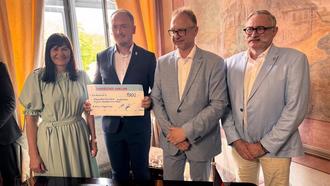 Als Gastgeschenk zum 20. Städtepartnerschaftsjubiläum überreichte die Hansestadt Anklam einen Scheck über € 1.000 für Kinder-, Jugend- und Seniorenarbeit in Limbazi