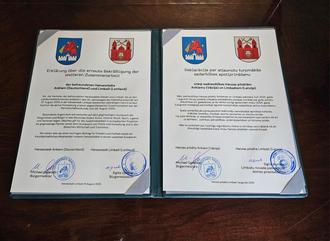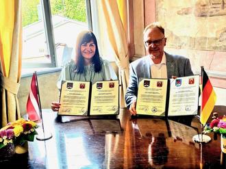 Bürgermeisterin Sigita Upmale und Bürgermeister Michael Galander präsentieren die neu unterzeichnete Urkunde zur Bekräftigung der künftigen Zusammenarbeit zwischen beiden Hansestädten