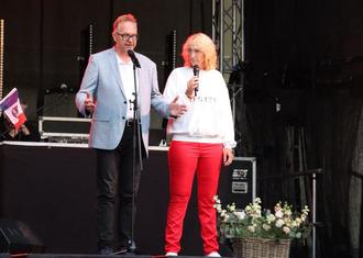 Bürgermeister Michael Galander überbrachte die Grüße an die Bürgerinnen und Bürger von Limbazi von der großen Festbühne aus, rechts unsere deutsche Freundin in Limbazi, Tina Runce