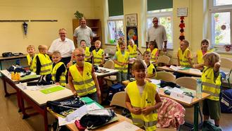 Zur Begrüßung gab es für die Erstklässler einen Stoffrucksack mit einem Stundenplan und einer Warnweste, gesponsert durch die GWA, für eine bessere Sichtbarkeit im Straßenverkehr.
