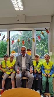 Die Warnwesten wurden sogleich anprobiert, denn viele der Kinder kommen morgens zu Fuß oder mit dem Fahrrad zur Schule und möchten natürlich gut gesehen werden.