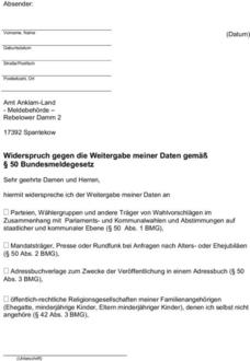 Gemäß § 50 des Bundesmeldegesetztes weist Ihre Meldebehörde darauf hin, dass jeder Betroffene das Recht hat, in nachfolgenden Fällen der Weitergabe seiner Daten zu widersprechen.