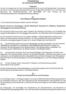 (1) Die Gemeinde Ducherow besteht aus den Ortsteilen Busow, Ducherow, Kurtshagen, Löwitz, Marienthal, Neuendorf A, Rathebur, Sophienhof, Schmuggerow und Schwerinsburg.