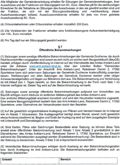 (4) Sind Karten, Pläne oder Zeichnungen Bestandteile einer Satzung, so können diese Teile anstatt einer öffentlichen Bekanntmachung nach Absatz 1 bzw. Absatz 2 grundsätzlich in den Diensträumen des Amtes Anklam-Land, Rebelower Damm 2, 17392 Spantekow, zur Einsicht während der Dienststunden ausgelegt werden (Ersatzbekanntmachung). Die Bestandteile sind in der Satzung zu bezeichnen. Absatz 3 Satz 3 ist entsprechend anzuwenden.