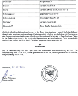 (1) Satzungen sowie sonstige öffentliche Bekanntmachungen der Gemeinde Ducherow, die durch Rechtsvorschriften vorgegeben sind soweit es sich nicht um solche nach Baugesetzbuch (BauGB) handelt, erfolgen durch Veröffentlichung im Internet auf der Internetseite des Amtes Anklam-Land unter der Adresse www.amt-anklam-land.de, über den Link/den Button "Gemeinden Bekanntmachungen". Unter der Anschrift: Amt Anklam-Land, Rebelower Damm 2, 17392 Spantekow kann sich jedermann Satzungen der Gemeinde Ducherow kostenpflichtig zusenden lassen. Textfassungen von allen Satzungen der Gemeinde Ducherow werden unter obiger Adresse bereitgehalten und liegen zur Mitnahme dort aus. Die Bekanntmachung und Verkündung ist mit Ablauf des 1. Tages bewirkt, an dem die Bekanntmachung in der Form nach Satz 1 im Internet verfügbar ist. Dieser Tag wird auf der Bekanntmachung vermerkt.