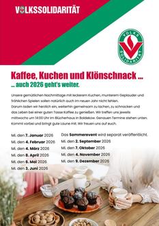 Während unserer Zusammenkunft wurde der Veranstaltungsplan für 2026 ausgegeben. Er beschert uns wieder 10 Treffen in unserem neuen Gemeindehaus. Im Sommer werden wir - wie jedes Jahr - einen gemütlichen Grillnachmittag veranstalten.