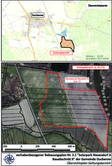 Die Gemeindevertretung der Gemeinde Ducherow hat in öffentlicher Sitzung am 07.06.2021 die Aufstellung des vorhabenbezogenen Bebauungsplanes Nr. 10 „Solarpark Neuendorf A“ beschlossen, in Verbindung mit der Aufstellung der 1. Ergänzung des Teilflächennutzungsplanes (Aufstellungsbeschluss am 22.06.2022). Der vorhabenbezogene Bebauungsplan Nr. 10 wurde am 22.05.2023 durch Beschluss der Gemeinde Ducherow in die vorhabenbezogenen Bebauungspläne Nr. 2 „Solarpark Neuendorf A“ und Nr. 2.1 „Solarpark Neuendorf A Bauabschnitt II“ aufgeteilt.