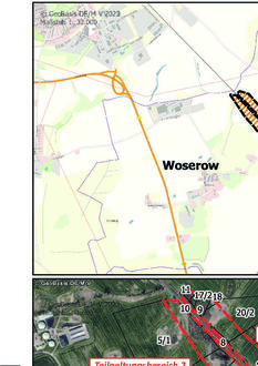 Der Geltungsbereich des Bebauungsplanes ist im beiliegenden Übersichtsplan durch eine gestrichelte Linie begrenzt und umfasst vier Teilgeltungsbereiche mit einer Gesamtfläche von ca. 48 ha. Teilgeltungsbereich 1 umfasst die Flurstücke 8, 9, 10, 11, 17/2, 18, 20/2 und 46/1, Flur 1 der Gemarkung Bargischow. Teilgeltungsbereich 2 umfasst die Flurstücke 5/1, 6 und 12/1, Flur 1 der Gemarkung Bargischow sowie die Flurstücke 1, 2, 3, 4/1, 5/1, 6/1 und 7, Flur 3 der Gemarkung Woserow. Teilgeltungsbereich 3 umfasst die Flurstücke 48/1, 49, 50, 51, 52/1, 52/3, 122, 123, 124/2, 125, 126, 129, 131, 133, 134/2, 145, 146 und 147, Flur 1 der Gemarkung Bargischow. Teilgeltungsbereich 4 umfasst die Flurstücke 137, 138, 139, 140, 141, 143 und 144, Flur 1 der Gemarkung Bargischow sowie das Flurstück 48/1, Flur 3 der Gemarkung Woserow.