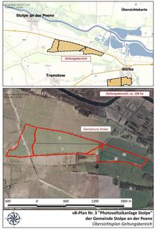Der Geltungsbereich des vorhabenbezogenen Bebauungsplanes ist im beiliegenden Übersichtsplan durch eine gestrichelte Linie umgrenzt und umfasst in der Gemarkung Stolpe, Flur 4, das Flurstück 15; Flur 7, die Flurstücke 2, 3 und 5; Flur 8, die Flurstücke 18 und 19. Die gesamte Flächengröße beträgt ca. 106 ha.