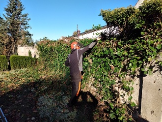 Mit einer Kettensäge wurde ein großer Teil des Mauerbewuchses entfernt. Hier ist noch viel zu tun.