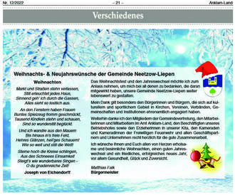 Das bevorstehende Weihnachtsfest und damit verbundenen Jahreswechsel möchte ich zum Anlass nehmen, um mich bei all denen zu bedanken, die daran mitgewirkt haben, unsere Gemeinde Neetzow-Liepen weiter lebenswert zu gestalten.