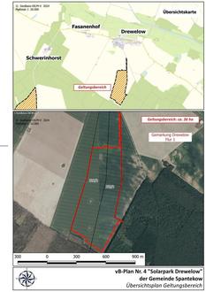 Der Geltungsbereich des vorhabenbezogenen Bebauungsplanes umfasst in der Gemeinde Spantekow, Gemarkung Drewelow, Flur 1 die Flurstücke teilweise: 220/2 und 221/2. Die Größe des räumlichen Geltungsbereichs beträgt 366.178 m².