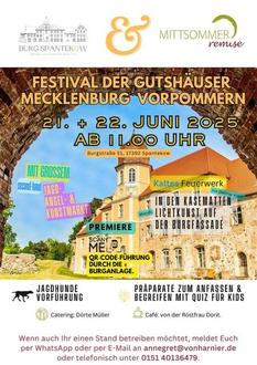 Spantekow, die historische Burg Spantekow öffnet am 21. und 22. Juni 2025 ihre Tore zur MittsommerRemise, einem besonderen Kultur- und Erlebnisevent in Mecklenburg-Vorpommern. Für den begleitenden Markt suchen wir noch Händler (gewerblich oder privat) und Kunsthandwerker, die ihre Waren und Handwerkskunst rund um die Themen Angeln, Jagd und Kunsthandwerk präsentieren möchten.