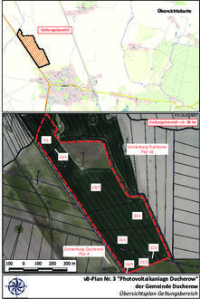 Die Gemeindevertretung der Gemeinde Ducherow hat am 22.05.2023 in öffentlicher Sitzung die Aufstellung des vorhabenbezogenen Bebauungsplanes Nr. 3 „Photovoltaikanlage Ducherow" der Gemeinde Ducherow gemäß § 12 Baugesetzbuch (BauGB) in Verbindung mit der 6. Änderung des Flächennutzungsplanes der Gemeinde Ducherow gemäß § 6 BauGB beschlossen. Die Aufstellung des Bebauungsplanes und die 6. Änderung des Flächennutzungsplanes der Gemeinde Ducherow können im Parallelverfahren durchgeführt werden. Der Gemeinde Ducherow entstehen hierdurch keinerlei Kosten, Diese werden vollständig vom Vorhabenträger übernommen.