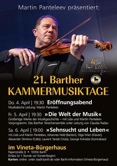 Das Vineta Bürgerhaus wird vom 4. bis 6. April 2024 erneut zum Schauplatz der "Kammermusiktage 2024", präsentiert vom Barther "Art Club Martin Panteleev". Die Veranstaltung verspricht ein beeindruckendes musikalisches Erlebnis unter der Leitung des vielseitigen Künstlers Martin Panteleev, einem der musikalischen Stars Europas.
