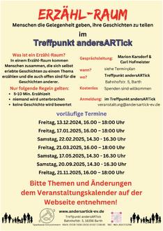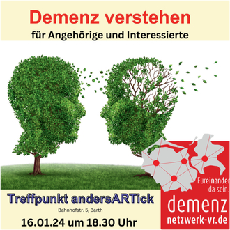 In Zusammenarbeit mit Regina Masuch vom Demenznetzwerk Vorpommern-Rügen bietet andersARTick e. V. am 16.01.25 von 18.30 Uhr bis ca. 21 Uhr Informationen rund um das Thema „Demenz verstehen“ im „Treffpunkt andersARTick“ in Barth an. In entspannter Atmosphäre wollen wir uns mit den Problemen rund um das Vergessen beschäftigen und mit einem Demenzparcours die Situation der Betroffenen etwas besser verstehen lernen. Da eine begrenzte Zahl von Plätzen zur Verfügung steht, erbitten wir eine Anmeldung bis zum 14.01.25 im Treffpunkt andersARTick, Bahnhofstr. 5, Barth oder per E-Mail an veranstaltung@andersartick-ev.de. Die Teilnahme ist kostenlos, Spenden für den Treffpunkt (Miete, etc.) sind willkommen.