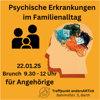 Eine hohe Zahl von Menschen in MV leben mit einer unsichtbaren Behinderung durch psychische Andersartigkeit. Die Familien und Partner der Betroffenen stehen bei der Begleitung dieser Menschen im Alltag oft vor großen Herausforderungen. Im Treffpunkt andersARTick bieten wir am 22.01.25 von 9.30 bis 12 Uhr Angehörigen und Partnern von Menschen mit psychischen Erkrankungen sowie alle Interessierten Gelegenheit, sich über den Umgang mit psychischen Erkrankungen im familiären Umfeld zu informieren und in einen Erfahrungsaustausch zu kommen. Da die Teilnehmerzahl begrenzt ist, wird um eine Anmeldung bis zum 20.01.25 gebeten (direkt im Treffpunkt andersARTick, Bahnhofstr. 5, Barth oder veranstaltung@andersartick-ev.de). Die Teilnahme ist kostenlos, Spenden für den Treffpunkt (Miete, etc.) sind willkommen.