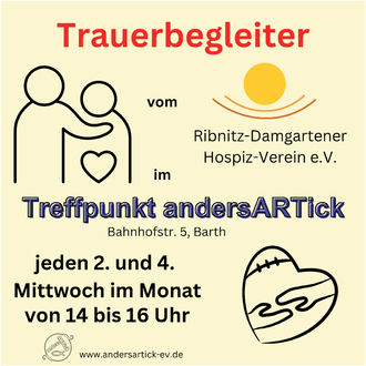 Der Verlust von geliebten Menschen ist häufig mit sehr viel Schmerz und heftigen Emotionen verbunden. Wenn eine vertraute Person plötzlich nicht mehr greifbar und ansprechbar ist, hilft es manchmal, mit jemand anderes darüber zu reden. Der Hospizverein Ribnitz-Damgarten hat Trauerbegleiter ausgebildet, die ehrenamtlich als Gesprächspartner jeden 2. & 4. Mittwoch im Monat von 14 bis 16 Uhr im Treffpunkt andersARTick, Bahnhofstr. 5 in Barth, zur Verfügung stehen. Angehörige, die Informationen um die Begleitung eines sterbenden Menschen suchen, können an diesen Tagen ebenfalls den Kontakt aufnehmen. Es können Informationen zur Arbeit des Hospizvereins gegeben, ein kurzes erstes Gespräch geführt, Termine/ Gespräche vereinbart und auf weiteren Hilfsmöglichkeiten hingewiesen werden. Das Angebot ist für Ratsuchende kostenlos. Eine Anmeldung ist vorab nicht notwendig.