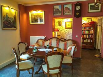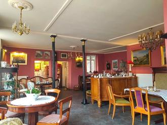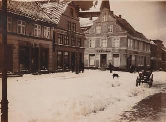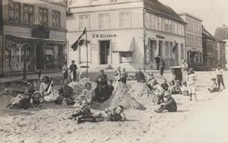 Der Umbau der Langen Straße zog sich Anfang 1911 "ewig" in die Länge. Walter Siemens sen. war ein Spaßvogel und er organisierte mit 25 bis 30 Kindern auf der zukünftigen neuen Hauptstraße von Barth eine "Strand-Leben-Szene". Als Krönung des ganzen stellte er noch ein großen Schild dazu: "Hier ruht der Barther Straßenbau!". Die Szene sollte für die Nachwelt fotografiert werden, doch ehe die damals noch so umständlichen Vorbereitungen für ein Foto abgeschlossen waren, erschien die Polizei und beschlagnahmte das Schild wegen "groben Unfugs"! So konnte die "Strandszene" des "ruhenden Barther Straßenbaues" ohne Schild fotografiert werden. Die Lange Straße in Barth trug im übrigem mehrere Namen, geschuldigt der jeweiligen Zeit. So hieß Sie ursprünglich Lange Straße, dann Straße der SA, dann Ernst Thälmann Straße und nun wieder Lange Straße. Bis vor wenigen Jahren war im Geschäftshaus von Klickow ein Puppenmuseum mit Kaffee, heute befindet sich hier das Kaffeehaus am Markt, wo man es sich gutgehen lassen kann. Die Inhaber Andrea und Burkhardt haben aus dem ehemaligen Geschäftsräumen von „Mester“ ein urgemütliches Ambiente geschaffen. Und wenn es die Zeit erlaubt, hält Burkhardt mit seinen Gästen oft ein humorvolles Schwätzchen.