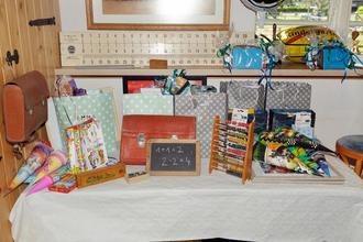 Der Geschenketisch der Kinder wurde von Achim Krocker mit nostalgischen Schulutensilien dekoriert.