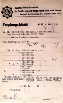 Bei dem unverfänglichen Absender Kräutergarten denkt man zunächst an gesunde Öko-Ernährung vom Wochenmarkt für die dienstverpflichteten deutschen Insassen des Bereitschaftslagers Barth-Stein sowie an die Ostarbeiter, Zwangsarbeiter, Kriegsgefangenen und Militärinternierten im benachbarten Lager Barth-Holz. Steckte da etwa nationalsozialistischer Humanismus dahinter? Dem dürfte wohl nicht so gewesen sein. In Barth-Holz wurden die Kräuter mit Sicherheit nicht dafür verwendet, die Speisen der Zwangsarbeiter und Gefangenen geschmacklich zu verfeinern und bekömmlicher zu machen. Sie waren wohl eher für die Mitarbeiter in der Verwaltung und für das Sicherheitspersonal bestimmt.
