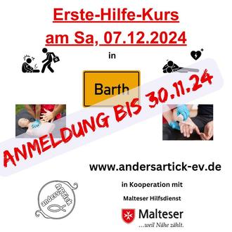 andersARTick e. V. bietet in Kooperation mit dem Malteser Hilfsdienst am 28.11.24 und am 07.12.24 Erste-Hilfe-Grundkurse in Barth an.