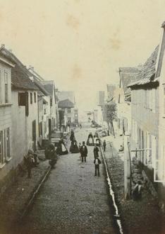 Das historische Foto zeigt die Fischerstraße um 1880, als in Barth noch das Wasser mittels Wasserpumpen zu Tage gefördert werden musste. Das Fischertor, welches 19 Jahre zuvor abgerissen wurde, lässt sich nur noch erahnen.