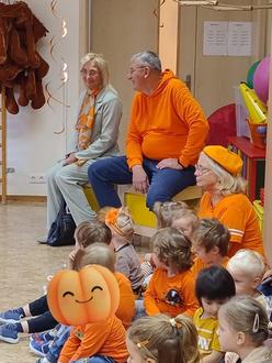 Um 9 Uhr begrüßten Kinder und Erzieherinnen gemeinsam mit Bürgermeister Hellwig und der ersten stellvertretenden Stadtpräsidentin Manns den besonderen Tag im Sportraum. Mit einem fröhlichen Lied zur Farbe Orange begann das bunte Programm. Auch draußen blieb das Motto nicht unbemerkt: Als der Straßenfeger vorbeifuhr, legte er einen kurzen Halt ein. Die Kinder nutzten die Gelegenheit, um die Straßenkehrmaschine aus der Nähe zu bestaunen.