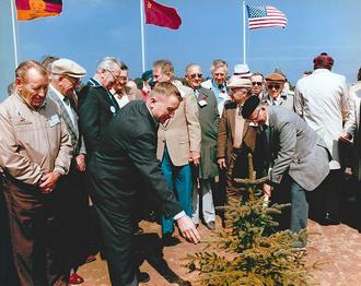 Am 1. Mai 1985 fand auf dem Barther Marktplatz die gewohnte Kundgebung statt. Unter den Teilnehmenden befanden sich allerdings diesmal auch die ehemaligen amerikanischen Kriegsgefangenen, teils in Begleitung ihrer Familien. Insgesamt waren 133 Gäste aus den USA angereist. Zu diesem Anlass hatten sich sehr viele Barther Bürgerinnen und Bürger versammelt. Auch die Medien waren zahlreich vertreten: Neben dem Deutschen Fernsehfunk der DDR und dem ZDF berichteten sogar amerikanische Fernsehteams vor Ort. Die Flaggen der USA – eigens aus Berlin herbeigeschafft –, der Sowjetunion und der DDR wehten über dem Platz. Es wurden Reden gehalten und Grußworte ausgetauscht. Im Anschluss bat der damalige Barther Bürgermeister Bernd Zeller zu einem Sektempfang ins Rathaus. Nach dem Mittagessen ging es für die Gäste weiter zum Gelände des einstigen Stalag Luft I, um die Gedenkstätte einzuweihen. Es wurde ein Stein mit einer Gedenktafel enthüllt, auf der stand: „Hier befreite die Sowjetarmee am 1. Mai 1945 Kriegsgefangene aus den USA und Großbritannien.“ Die Anwesenden pflanzten zudem auf jeweils drei dreieckigen Grundflächen Bäume, Stechfichten aus Colorado für die USA, russische Birken und deutsche Linden. Es drängt sich natürlich die Frage auf, warum waren die Briten und ihre Mitstreiter aus dem Commonwealth und anderen Nationen nicht dabei? Die wahrscheinlichste Antwort liegt auf der Hand, niemand hat sie eingeladen, weder die Amerikaner noch die DDR.