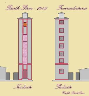 In der Vergangenheit waren es die Einwohner von Barth-Tannenheim gewohnt, an der Ecke Eschenweg/Kiefernweg ihre Gelben Säcke zur Abholung bereitzustellen. Dafür bot sich eine uralte, recht unscheinbar wirkende Betonplatte an. Im vergangenen Jahr rückten nun Bauleute an, um diese Platte zu entfernen. Was ihnen aber unverhofft mehr Mühe bereitete, als sie vermutet hatten. Denn unter der Platte verbarg sich ein Fundament, das laut Archivunterlagen immerhin zwei Meter tief in das Erdreich gereicht haben soll. Was hatte es auf sich, mit diesem Fundament? 1940 reichte die "Verwertungsgesellschaft für Montanindustrie" Berlin-Charlottenburg beim Landratsamt in Franzburg-Barth die vom "Bauatelier Ernst Neufert" erarbeiteten Unterlagen zum Bau des Bereitschaftslagers Barth-Stein ein. Man ging von 2000 Einwohnern aus. Bei den geringen Abständen der Gebäude zueinander, sowie den zahlreichen Schornsteinen und der leichten Bauweise der Dächer bestand eine nicht zu unterschätzende Feuergefahr. Zumal das Wohnlager in den Planitzer Tannen unmittelbar an einem Waldgebiet errichtet werden sollte. Deshalb bekam aufgrund einer Forderung des Landrates Boettcher das Wohnlager eine Feuerwache, einschließlich eines Turmes zum Trocknen der Schläuche und für Übungszwecke. Hierbei unterlief dem Bauingenieur aus Berlin bei der Berechnung der Statik des Turmes zwar ein Fehler, der jedoch offensichtliche keine hemmende Wirkung auf die Baugenehmigung nach sich zog. Letztlich gab der Landrat ohne Einwände seine Zustimmung.
