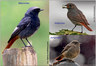 Der Hausrotschwanz ist ein kleiner Vogel - etwa so groß wie ein Spatz. Er hat ein tolles Rot am Schwanz, das ihm seinen Namen gibt - besonders schön bei den Männchen. Der Körper ist recht unscheinbar schwarz-grau gefärbt.