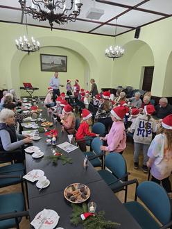War das eine Freude bei den Senioren vom Klönschnack, als auf einmal 18 Hortkinder aus der Musik – AG unseres städtischen Horts „Villa Kunterbunt“ in Begleitung und unter sachkundiger Anleitung der Mitarbeiterinnen Frau Rothe und Frau Strzeletz in den Rathaussaal einzogen und auf der Bühne Aufstellung nahmen! Was dann folgte, war aber noch besser. Mit viel Begeisterung und Können, dazu immer wieder mit Begleitung von Frau Strzeletz an Keyboard und Gitarre, führten die jungen Künstlerinnen ein abwechslungsreiches Weihnachtsprogramm aus 24 Liedern und Gedichten auf, wobei jeder einzelne Beitrag – wie in einem Adventskalender – mit der jeweiligen Nummer auf bunten Schildern angezeigt wurde. Dabei versprühten die Akteure eine Fröhlichkeit und gute Laune, die auch Profi-Künstlern alle Ehre gemacht hätte. Dafür gab es nicht nur kaum endenden Applaus für alle Hortkinder, sondern auch eine Einladung zu Saft und Kuchen vom Veranstalter, Volker Reintjes als dem Quartiersmanager der Stadt Barth. So saßen Jung und Alt einträchtig an der Kaffeetafel beieinander, bis die Buszeiten für die Fahrkinder eine Rückkehr zum Hort erforderlich machten. „So etwas Schönes kann man für Geld nicht kaufen“, fasste eine der Teilnehmerinnen den Nachmittag treffend zusammen.