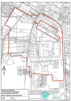 (1) Im nachfolgend näher beschriebenem und abgrenzten Gebiet liegen städtebauliche Missstände vor. Dieser Bereich soll durch städtebauliche Sanierungsmaßnahmen wesentlich verbessert oder umgestaltet werden. Das insgesamt ca. 28,5 ha umfassende Gebiet wird hiermit förmlich als Sanierungsgebiet festgelegt und erhält die Bezeichnung „Barth Süd".