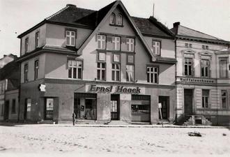 Wenden wir uns nun der ehemaligen Sundischen Straße mit der Hausnummer 16 zu, in dem der Kaufmann Ernst Haack seine Geschäfts- und Wohnräume hatte. Man konnte den Laden durch zwei Türen betreten. Der Geschäftsmann Ernst Haack wurde am 18.11.1886 in der Nähe von Gingst/Rügen geboren. Am 11.11.1911 eröffnete Ernst Haack sein Geschäft in Barth. Seine Wahl erwies sich als gut, und mit glücklicher Hand konnte er seinen Betrieb von Jahr zu Jahr weiter ausbauen. Im Haack’schen Betrieb wurden sowohl im Verkauf als auch im Kontor eine Reihe junger Leute zu tüchtigen Kaufleuten ausgebildet, von denen sich einige in Barth selbstständig machten, wie Albert Mester, Willi Rüting oder Heinz Kraeft. Bis zur Wende und noch einige Jahre darüber hinaus wurde hier ein Lebensmittelmarkt der HO betrieben. Viele Barther kennen diesen noch als „Tempo-Eck“ oder „Früh & Spät“. Doch auch irgendwann schloss auch dieser Laden. Bis vor kurzem beherbergte das Geschäft einen Frisörsalon.