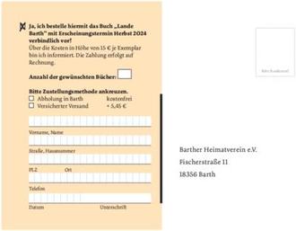 Sie haben die Möglichkeit, den Bestellschein in folgenden Einrichtungen in der Stadt auszufüllen und dort abzugeben: Barth Information, Stadt-Biblithotek, Juwelier Pohla, Markthalle Barth, Fotofachgeschäft Friedrich, Optik de Waal, Augenoptik Weinhardt.